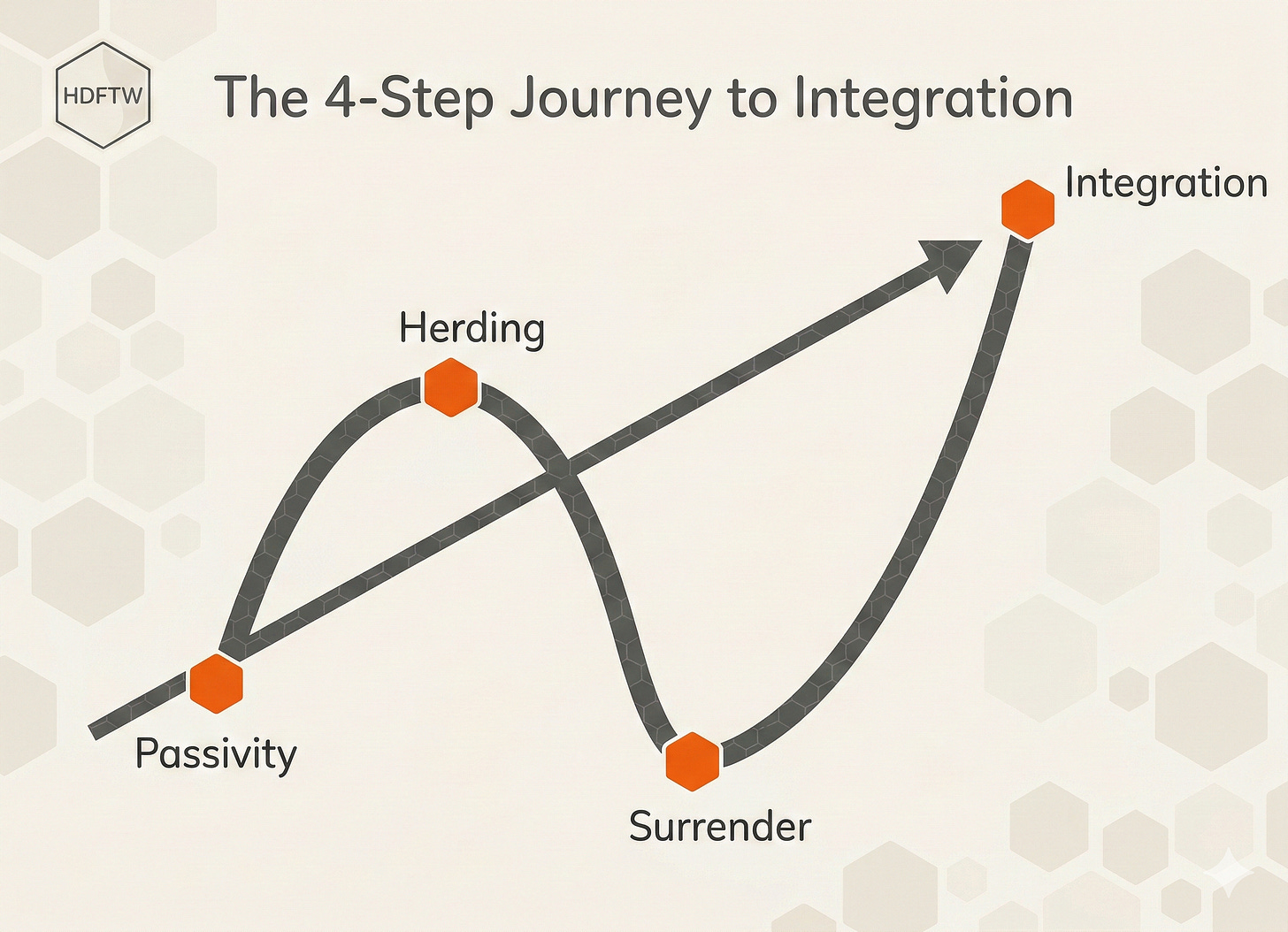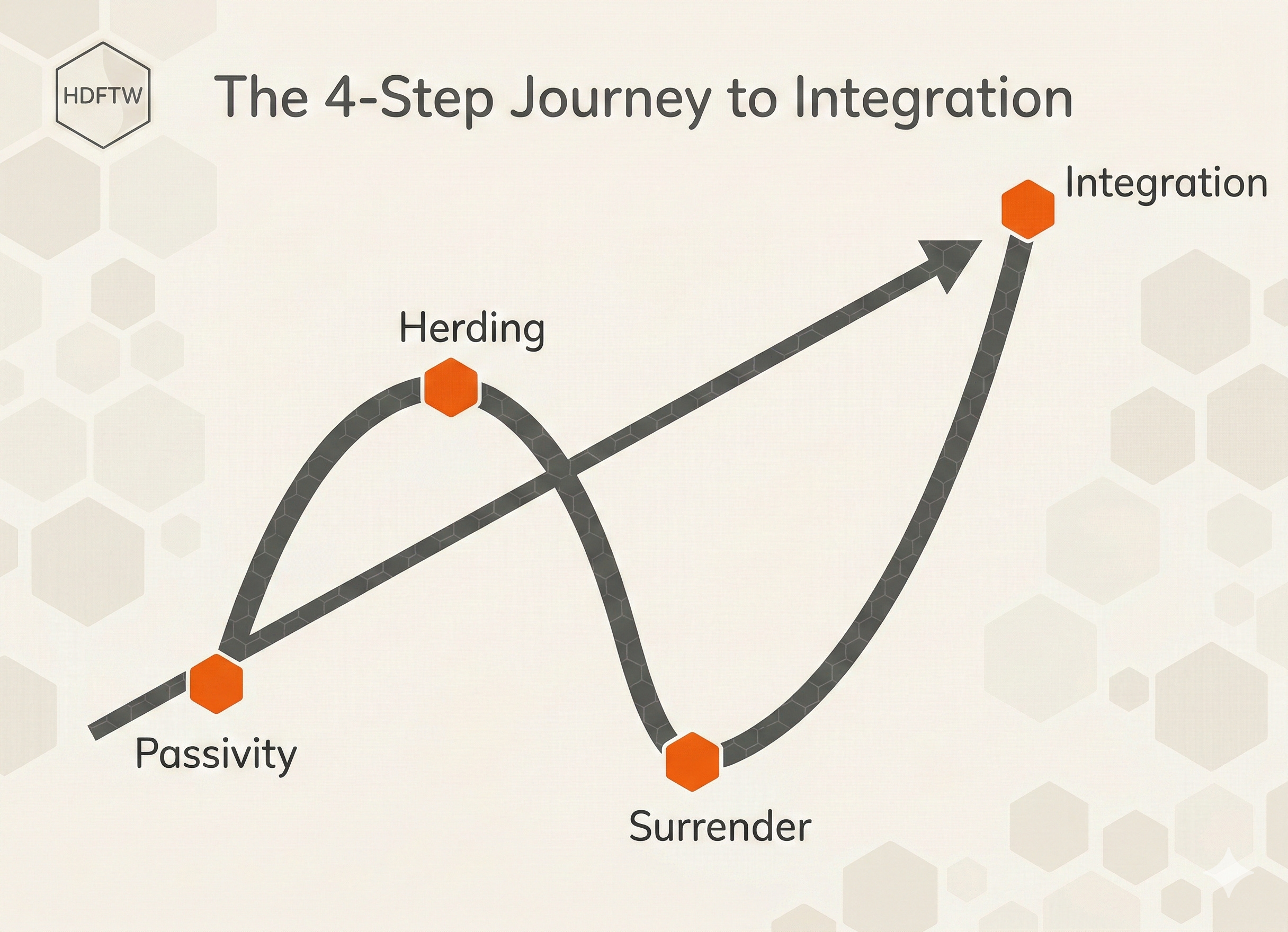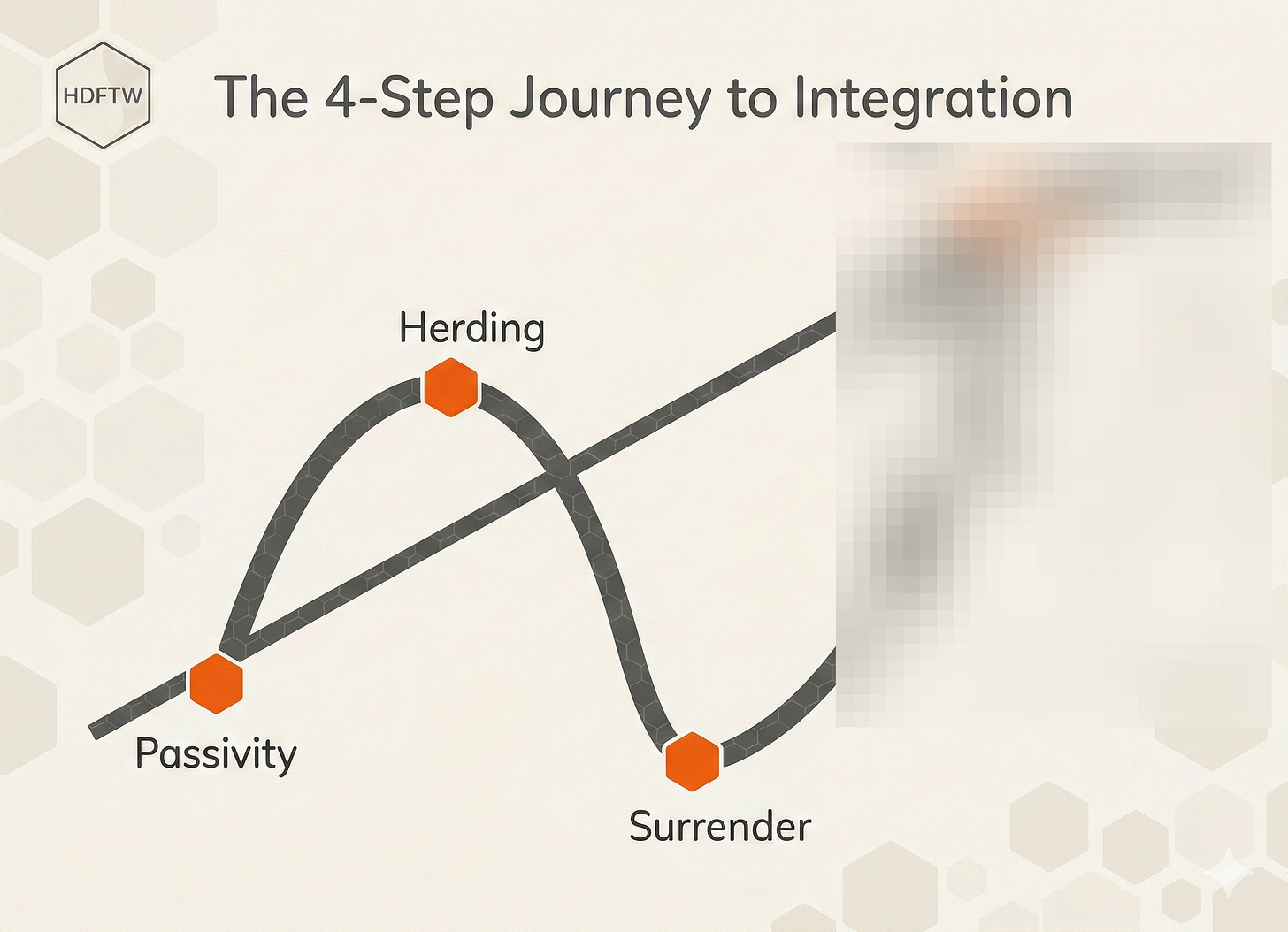 Herding has something real in it too. The impulse to move, to seek, to not sit still, that’s energy. The problem was never the energy. It was the direction. Herding pointed it outward, toward the crowd. Integration points it inward, toward the wiring.