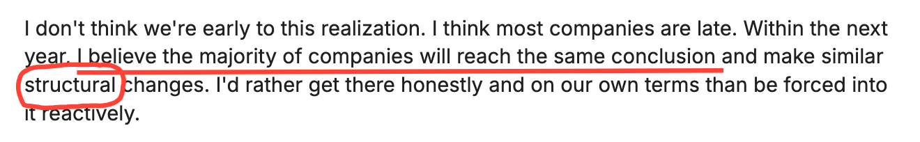 Despite the difficulty for those tech workers affected and in making this one-way door decision, he dared to say this important, quiet thing out loud.